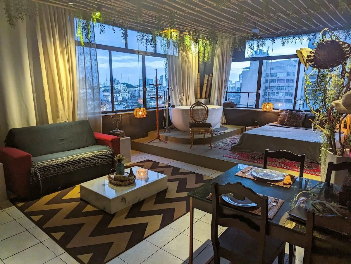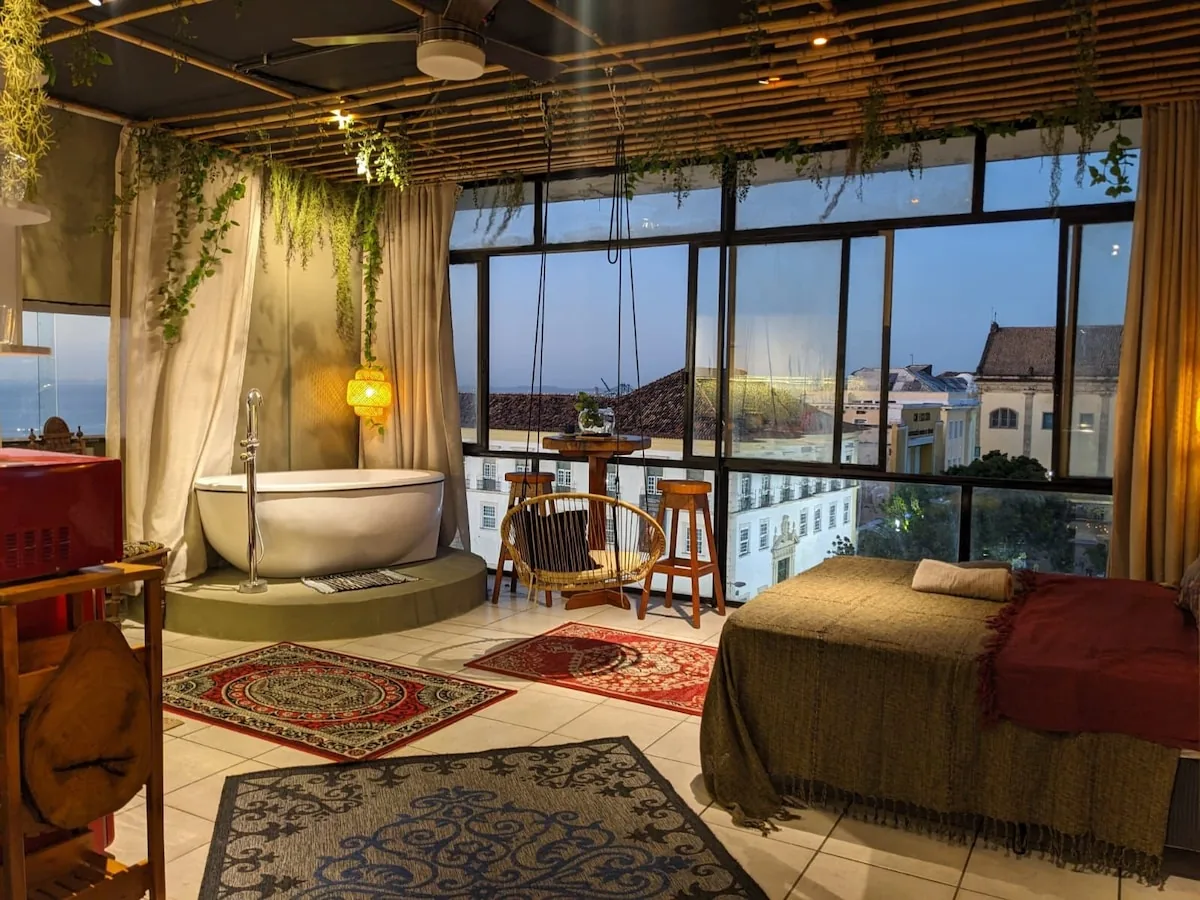 Este loft único foi projetado para ser a primeira acomodação Airbnb cinco estrelas da região. Teto de bambu, iluminação LED cenográfica, antiguidades garimpadas pela Bahia — algumas com mais de 100 anos — e uma jacuzzi privativa para o fim do dia. Cozinha gourmet com balcão de granito brasileiro e fogão a gás de cinco bocas. Cama queen ortopédica, ar-condicionado e internet de 100 MB para quem trabalha em viagem. Vista parcial do famoso Elevador Lacerda.