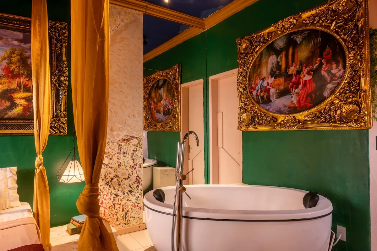 Conceived as the region's first five-star Airbnb, this dramatic loft layers a bamboo-slatted ceiling, theatrical LED lighting, and antiques hunted across Bahia — some over a century old — with a private soaking jacuzzi for the end of the day. Gourmet kitchen with Brazilian granite counters and a five-burner gas range. Queen orthopaedic bed, air conditioning, 100 MB internet for travellers who work. Partial view of the famed Lacerda Elevator.