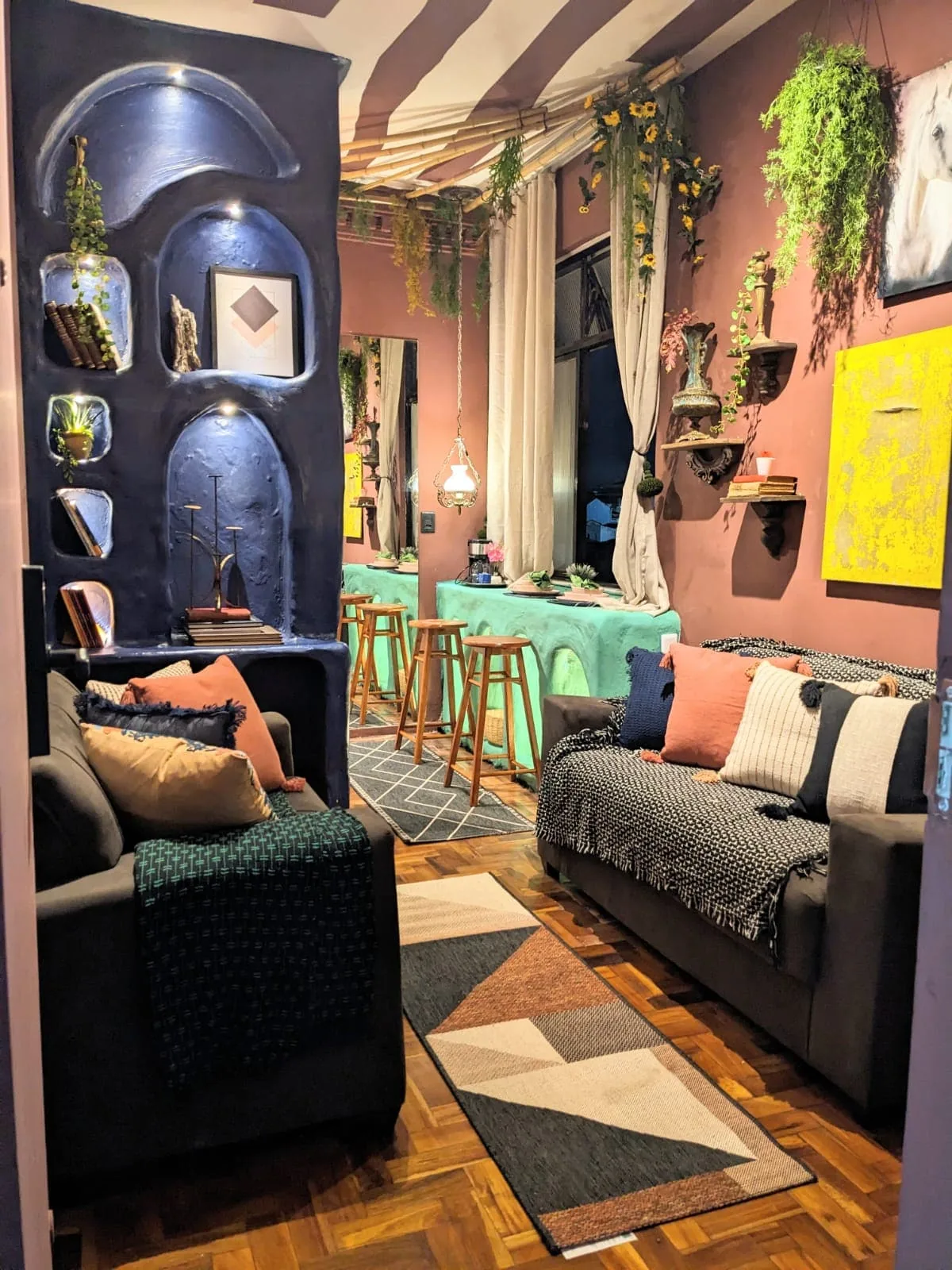Um loft dramático aos pés do elevador — teto de bambu, jacuzzi profunda, antiguidades baianas centenárias e uma vista que pertence ao céu.